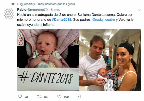 Por su parte, la cuenta Autodante (@autodante) seguirá divulgando cada canto íntegro en su original y en la traducción de Bartolomé Mitre, en algunos casos acompañado de las aguafuertes de William Blake. Por si fuera poco, hasta un niño, nacido a principios de enero, ha sido bautizado Dante, a raíz del fenómeno, como lo muestra este tuit:
