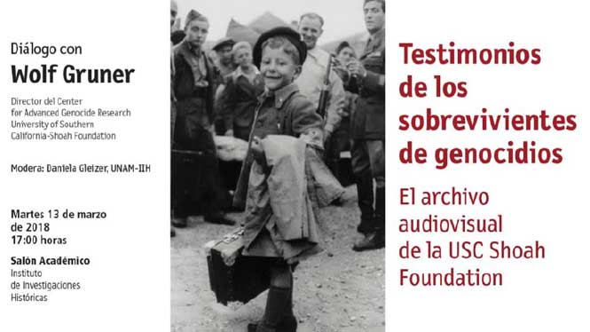 Diálogo. Wolf Gruner dirige el Centro de Investigaciones Avanzadas sobre Genocidio en la Universidad Southern California-Shoah Foundation. Estará en México discutiendo sobre el archivo audiovisual de la institución y su importancia en la investigación de procesos de genocidio en la historia. En particular, abordará el tema de los supervivientes y sus testimonios. La conversación será moderada por la historiadora mexicana Daniela Gleizer, quien se ha especializado en el exilio judío en México.