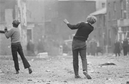 Gilles Caron. Manifestantes católicos, batalla del Bogside, Derry, Irlanda del Norte, agosto de 1969. Gilles Caron/ Fondation Gilles Caron/Gamma Rapho. Cortesía del MUAC.