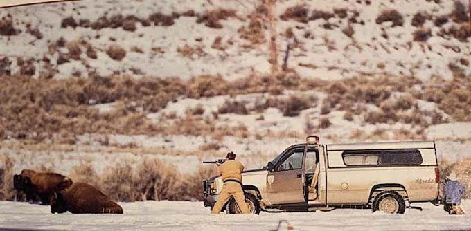 Busco otro ejemplo memorable. En la revista Audubon, de mayo-junio de 1997, apareció un ensayo de Doug Peackok, “La masacre de Yellowstone”, lamentando la muerte de cerca de dos mil búfalos acusados de transmitir una bacteria que produce brucelosis y pone en peligro la vida de sus predadores bípedos pensantes. Las fotos de William Campbell que acompañaban la denuncia congelan la imagen de guardias forestales, armados de rifles de alto poder, en motocicletas equipadas con esquíes para la nieve, recorriendo los campos nevados, disparando sobre los voluminosos bisontes, que caen ensangrentados sobre la inmensa blancura.
