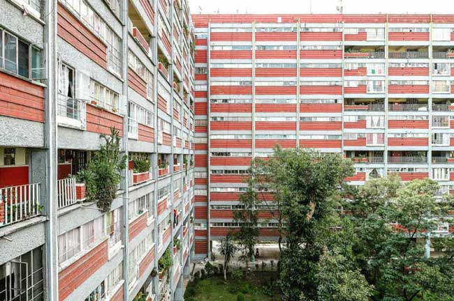Estos dos conjuntos habitacionales de la Ciudad de México representan el momento de llegada y la cúspide del estilo Internacional a la arquitectura mexicana. Al mismo tiempo, sirven como telón de fondo, incluso quizá como metáfora, para una cadena de acontecimientos sociales y políticos. La unidad habitacional Miguel Alemán, “el multi”, es uno de los hitos de la arquitectura moderna en México, un ícono que a menudo ha sido escenario de películas sobre el desarrollo del Estado mexicano progresista. Sin embargo, después de los acontecimientos de octubre de 1968, los bloques de departamentos de Tlatelolco temblaron una vez más, esta vez por un terremoto en septiembre de 1985 en el que cientos de personas murieron en un edificio que se derrumbó. Para prevenir un desastre aun mayor, algunos de los bloques que quedaron se redujeron de seis a cinco pisos: el plan maestro modernista se ajustó a la escala humana.