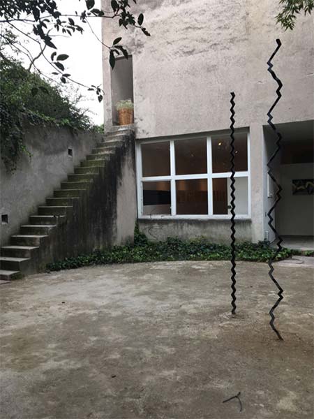 Actualmente estos talleres son la sede de una exposición del escultor mexicano Ricardo Regazzoni (Ciudad de México, 1942). Regazzoni se formó inicialmente como arquitecto y después se dedicó a las artes plásticas. Estudió en París y también realizó una estancia en el Smithsonian Institute gracias a una beca Fullbright que el propio Barragán le insistió que consiguiera. Al ver las columnas del escultor, Barragán le dijo que le gustaría integrarlas a alguno de sus proyectos. Aunque esta colaboración nunca sucedió, la exposición en este espacio ensaya cómo pudo haber sido. Las piezas geométricas emergen en pequeñas áreas despejadas del jardín. Las esculturas son formas livianas y depuradas; las sombras, elocuentes. La hoja de oro que recubre algunas de ellas evoca algunos cuadros de Mathias Goeritz. La serie se llama Fugas y variaciones. En el jardín, las cadenas y líneas zigzagueantes se comprimen para envolver una de las habitaciones con columnas más sólidas y chaparras. En la otra, los elementos geométricos y los materiales con los que nos habíamos familiarizado en el exterior cambian de escala, se acuestan o se suspenden.