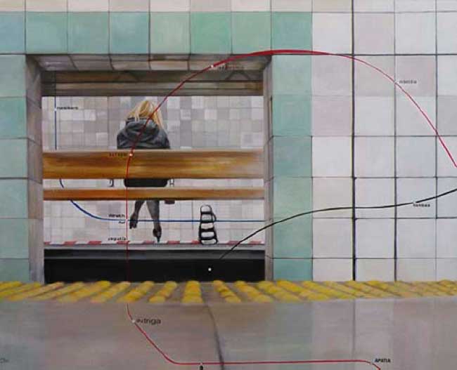 Diana Salazar (1972) concibe su trabajo pictórico desde la idea de que todo estado mental o emocional es transitorio y fugaz. Con una mezcla de imaginación y realidad, la artista consigue retratar los sentimientos de las personas en escenarios tan cotidianos como los pasillos o vagones de cualquier metro. Pasajeros es una serie de cuadros con fondos grises y luces tenues en donde los protagonistas, personajes solitarios y ensimismados, comparten caminos de colores que aluden, por una parte, a las estaciones del tren, y por otra al trayecto de las emociones. Así pasamos de la ira a la angustia y a la tristeza de la misma manera, aparentemente, en que recorreríamos cualquier línea del sistema de transporte de la ciudad. La exposición hace evidente que todo, dentro y fuera de nosotros, es un estado condenado al cambio. Somos pasajeros de la ciudad porque nos movemos de un sitio a otro, pero nuestras emociones también viajan dentro de cada uno y se modifican constantemente. Salazar nos dice, entonces, que hagamos consciente este viaje, pues si nos distraemos podemos perder —por el ruido interno o externo— la estación en la que debemos bajarnos.