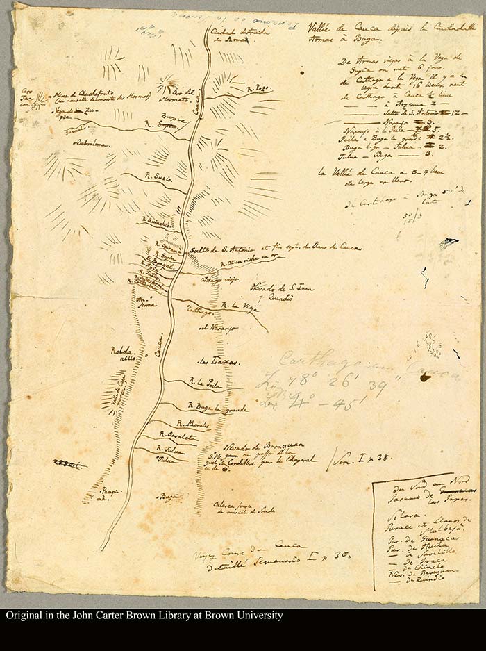 “Boceto del Valle del Cauca” de Armas a Buga, del diario de Aimé Bonpland. Cortesía de la John Carter Brown Library, Brown University.