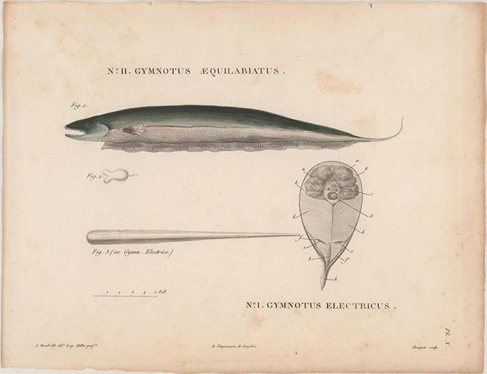 Anguila eléctrica, grabado por Leopold Müller, en base a dibujo de Humboldt. Cortesía de: John Carter Brown Library, Brown University.