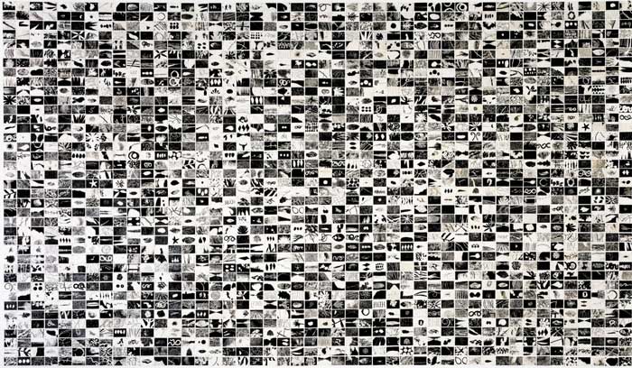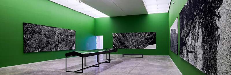Otras formas de registro: la misma higuera muchas veces, fotos superpuestas cuyo paisaje contiene el paso del tiempo o un muro completo (Script) cubierto de pequeñas serigrafías de detalles, texturas, siluetas contrastadas; serpientes, semillas, garabatos, hojas reunidas a lo largo de décadas que aspiran a contener un todo y a la vez traicionan esa voluntad, se repiten sugiriendo algo infinito. Un muro, por cierto, muy adecuado para tomar una foto si no puedes resistir el impulso.