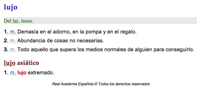 En batallas más justas y relevantes, una asociación española que representa a la crème de la crèmede los ajuares, el Círculo Fortuny, también le hizo sus peticiones a la RAE, aprovechando el viaje. El Círculo Fortuny, para hablar en plata, materia que tanto les gusta y que alguna que otra vena abrió en América Latina, sirve de foro a las llamadas “empresas e industrias de alta gama”, y cuenta con un portavoz que representa sus deslumbrantes intereses. El asunto es que la RAE tiene una definición un poco negativa de la palabra que los de Fortuny llevan en boca como un óbolo: “lujo”. La RAE la define así: