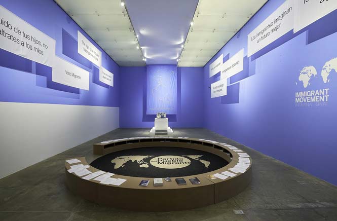 “Tania Bruguera: Hablándole al Poder.” Vista de instalación de Movimiento Inmigrante Internacional, Cortesía del MUAC, 2018.