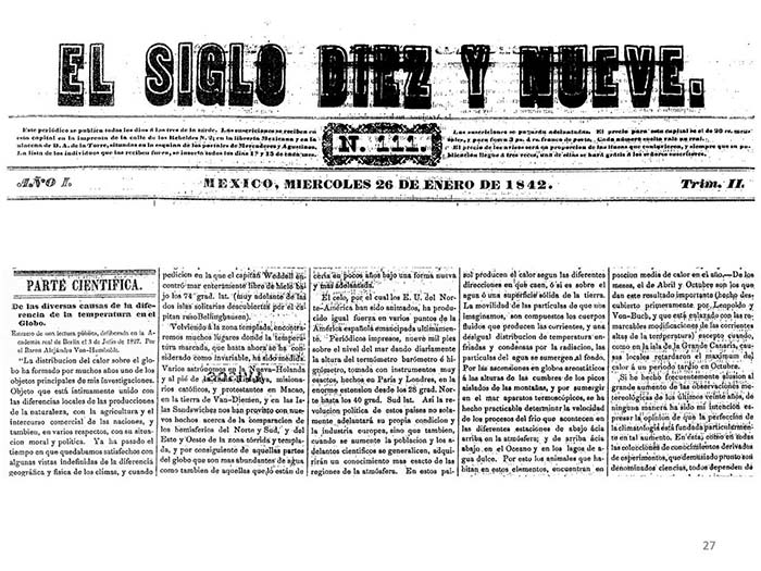 Fragmento de un artículo de Humboldt publicado en el diario mexicano El Siglo XIX.