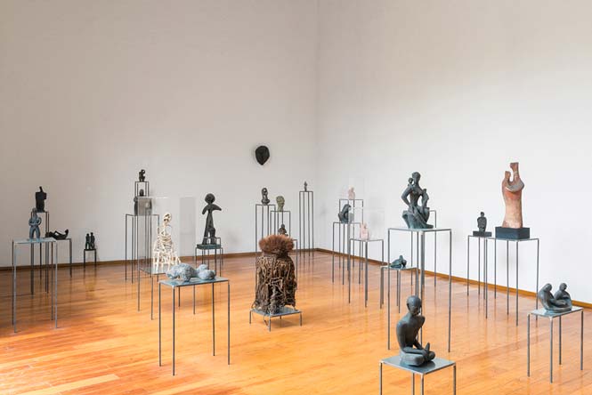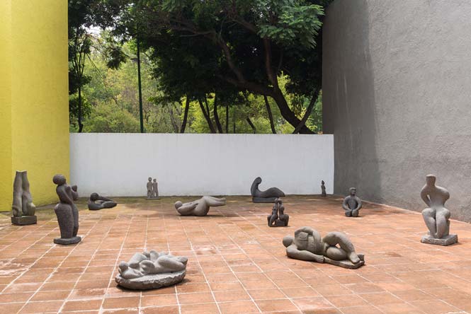 El recorrido en El Eco da la sensación de estar frente a piezas que encontraron voz propia muchos años atrás. Si bien la muestra reúne obra de cerca de sesenta años de producción, el transcurso del tiempo es prácticamente imperceptible dado que el conjunto guarda cierta relación entre sí, ya sea por el tema o por la manera en que se comporta su material: las piezas que se exhiben en el patio del museo son de mediano y gran formato y muestran cuerpos humanos en reposo —en su mayoría recostados— o en una especie de postura de meditación. Aunque cada pieza está posicionada de manera distinta, parecería que entre ellas entablan una conversación como si fuera un solo cuerpo de obras que ha existido en conjunto de manera intemporal.