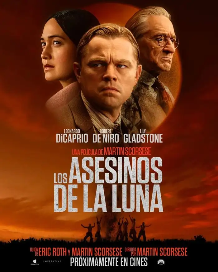 Un denso claroscuro alumbra la escena. Es evidente que Rodrigo Prieto, el fotógrafo de la cinta, quiere crear un efecto de irrealidad pesadillesca. Los rostros se marcan con terrible precisión. Reconocemos a algunos: el sheriff, los médicos, el banquero, los petroleros, las señoras de alcurnia, y el abogado (Brendan Fraser) de William K. Hale (Robert de Niro) —tío de Ernest Burkhart, sospechoso de causar la muerte de 24 nativos Osage y directamente acusado del asesinato de uno de ellos, Henry Roan.