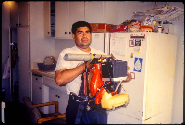 Rubén Ortiz Torres, Gody Sánchez con la sopladora de hojas adaptada por él, 1999, fotografía. Imagen cortesía del Museo Universitario de Arte Contemporáneo de la UNAM