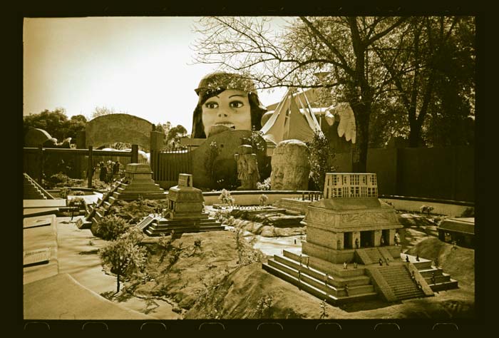 Las herramientas no son el único objeto de la reflexión. Una parte significativa de la producción de Rubén Ortiz está relacionada con la réplica de una antigüedad falsificada. Series como La historia ya no es lo que era, o bien la película Fronterilandia (1995), hecha en una colaboración muy productiva con Jesse Lerner,4 realizan un inventario de ruinas falsas, traducciones imposibles, maquetas de famosos sitios históricos y arqueológicos, edificios neomayas, grupos que imitan a los Beatles en la Ciudad de México, partenones surtidos a lo largo y ancho del planeta y gigantescos sombreros de charro que fungen como drive-ins en la carretera. También tiene, como el personaje de Paul Auster en Leviatán, una nutrida colección de réplicas de la Estatua de la Libertad A diferencia del inolvidable Ben Sachs, que en la novela se dedica a dinamitar todas las réplicas de ese monumento, Ortiz les toma fotos, pues la idea es que la apropiación simbólica pasa a través de una modificación que a fin de cuentas resulta liberadora.