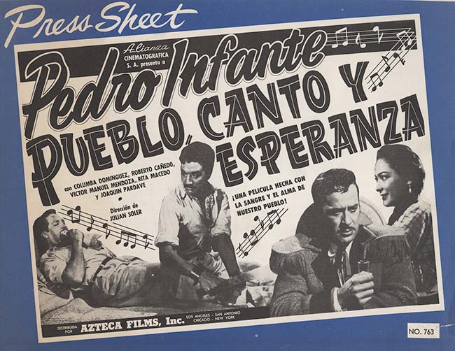 Hoja de prensa de la película Pueblo, canto y esperanza (1954), película conformada por tres cortometrajes: Cuento cubano (Julián Soler), Cuento colombiano (Alfredo B. Crevenna) y Cuento mexicano (Rogelio A. González), este tercero, protagonizado por Pedro Infante. Colección y Archivo Fundación Televisa.
