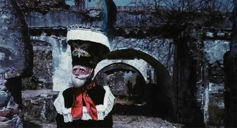 Finalmente, entre estas dos figuras, en la persecución central de la película, aparece un nuevo símbolo colonial: Mary queda atrapada en una danza de Chinelos. Su padre, disfrazado, la caza. Entre la turba, Mary no puede moverse, grita, se desespera. Nunca fue tan vulnerable. La celebración colonial que se burlaba de los hacendados, que imitaba sus gestos, sus barbas y caras rojas, aterroriza a Mary. Y tal vez, ese es el último comentario político de Moctezuma; un comentario tan sutil como pertinente.