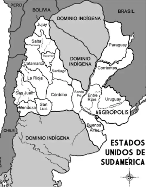 FIGURA 5: En blanco, mapa de Estados Unidos de Sudamérica, país que Sarmiento pretendía fundar con capital en la isla Martín García, rebautizada como Argirópolis.