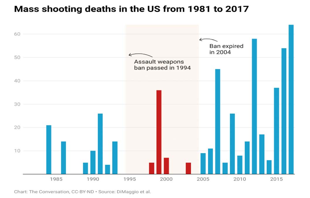 Un estudio de Charles DiMaggio, del Departamento de Cirugía de la Universidad de Nueva York, acerca de los tiroteos masivos ocurridos entre 1981 y 2017, concluye que la prohibición sobre armas de alto poder contribuyó a que hubiese un “70 % menos de probabilidades de que hubiese muertos”.23