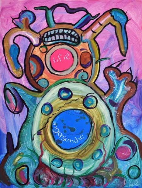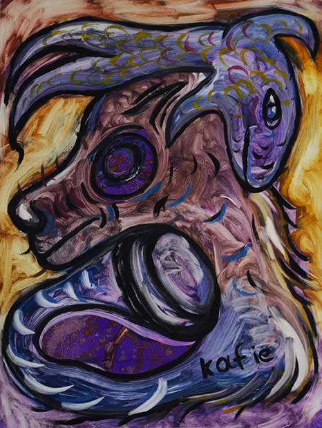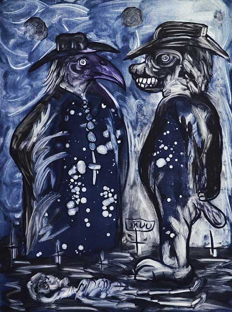 Filogonio pinta sin bocetos, los personajes fluyen desde su imaginación hasta su lienzo pasando por sus dos manos. “Casi todos los personajes que están ahí son animales, eso que somos los seres humanos realmente ¡y ni animales a estas alturas! somos bestias y esa es la otra parte que tenemos dentro de nosotros. Manejo la idea del nahualismo desde la conducta del ser humano, eso que para mí es el animal que todos tenemos dentro. Por eso las imágenes son sarcásticas, hasta grotescas, porque es como la humanidad que yo veo.”