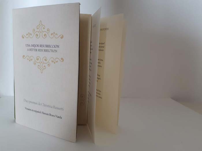 Los siguientes tres poemas pertenecen al libro Una mejor resurrección. Diez poemas de Christina Rossetti que acaba de poner en circulación la editorial artesanal La Dïéresis. La editorial se caracteriza por su empeño incansable en crear ejemplares únicos, coleccionables, con una enorme variedad de técnicas de encuadernación e impresión tradicionales y una clara pasión por la poesía.
