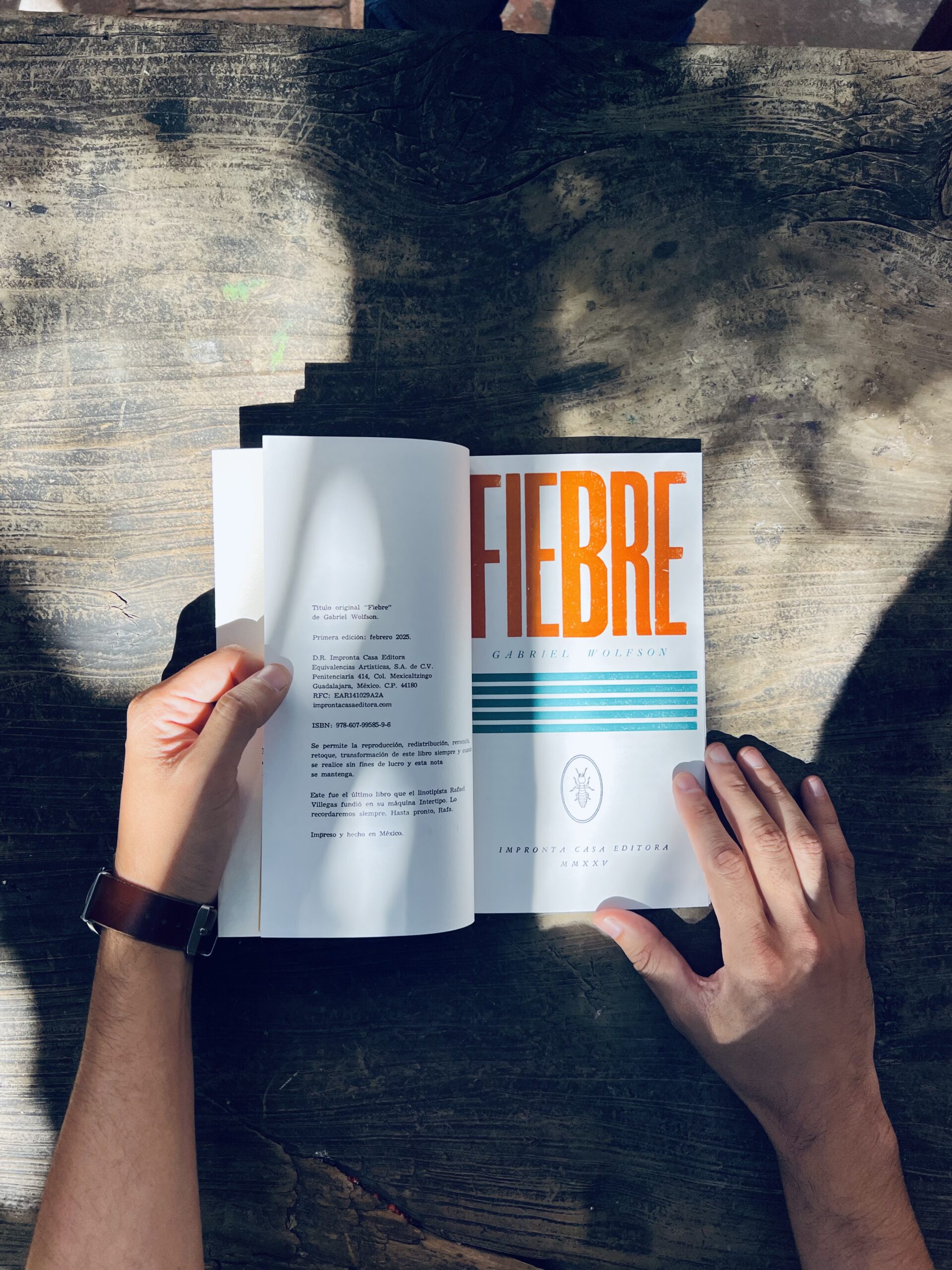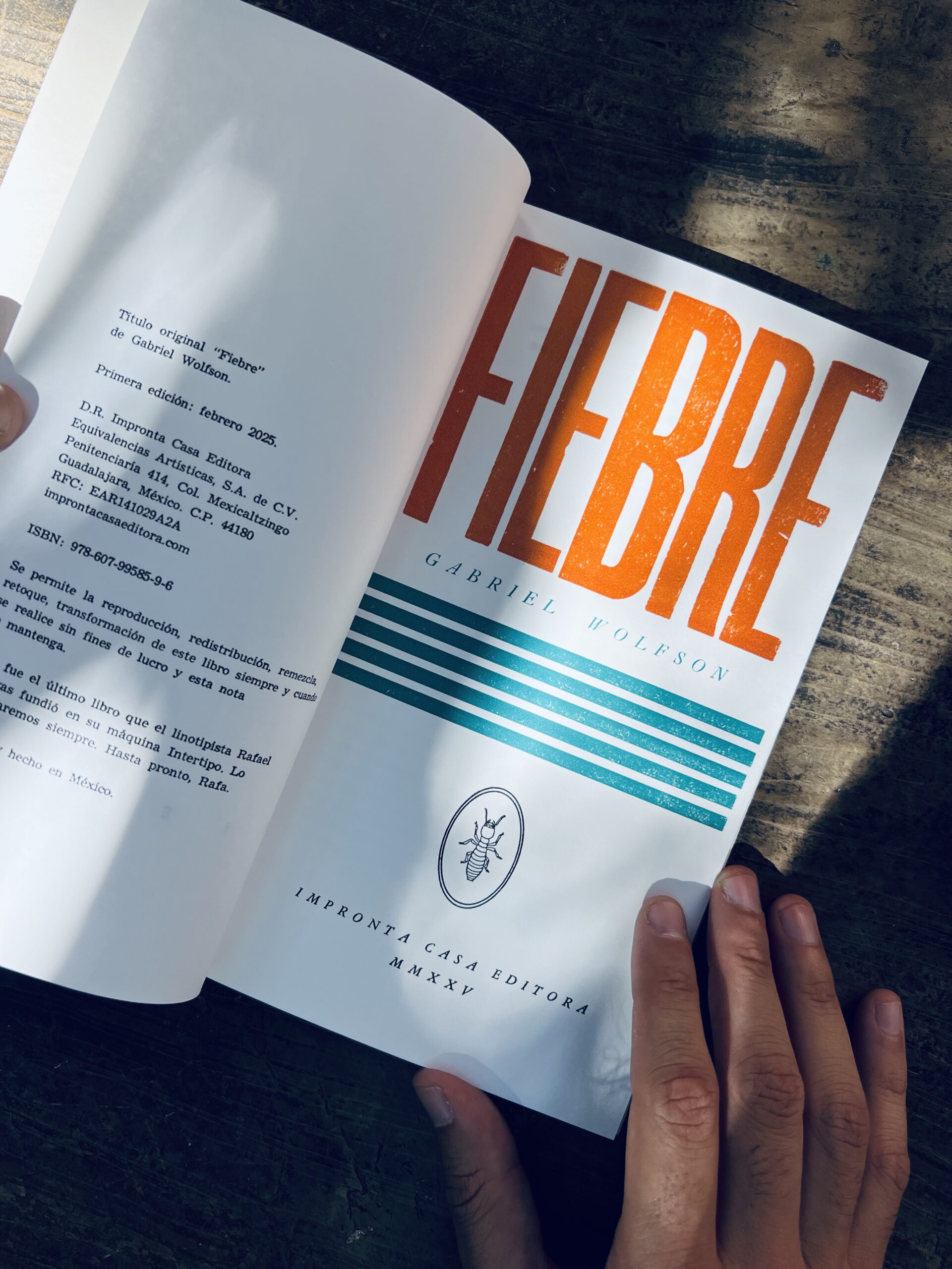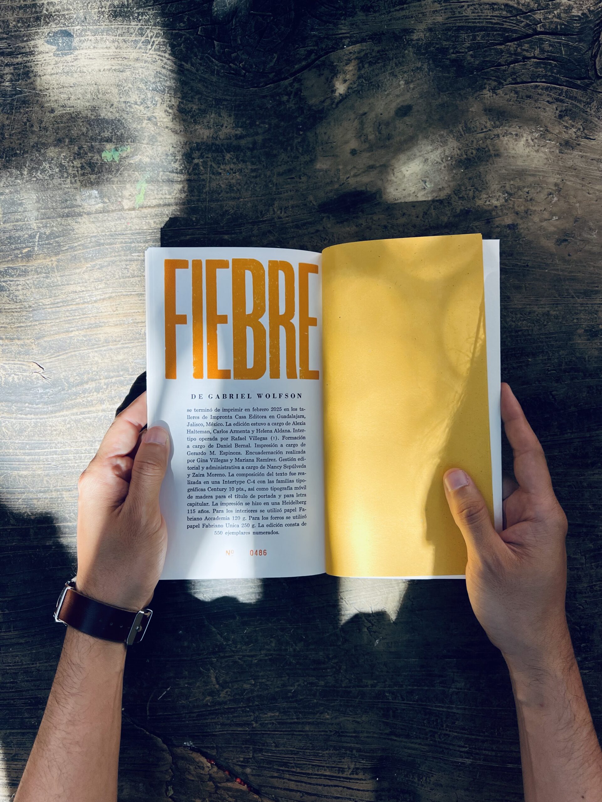 Quizá por ahí debimos haber comenzado. Fiebre. Dos puntos. Un libro de Gabriel Wolfson. Un libro que se terminó de imprimir en febrero de 2025, en los talleres de Impronta Casa Editora en Guadalajara, Jalisco, México. Un libro que se imprimió en “una Heidelberg 115 años. Para los interiores se utilizó papel Fabriano Accademia 120 g. Para los forros se utilizó papel Fabriano Unica 250 g. La edición consta de 550 ejemplares numerados”.