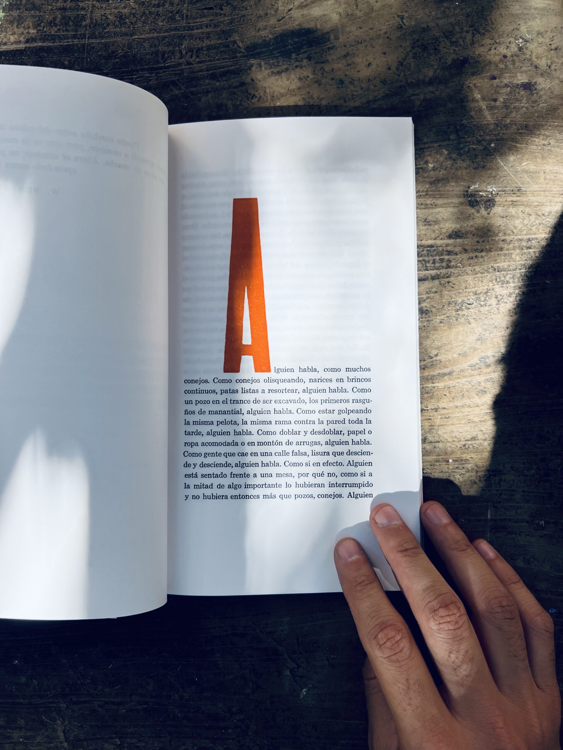 Metadata que testimonia convicciones: una fe material muy evidente. Pero, con perdón del alguien que habla y aclara aquello de las metáforas y de las trampas al interior del texto, queda la sospecha de una convicción más bien simbólica, textual, preconizada por los detalles materiales. Sí, habría sido mejor comenzar por aquí. Especificando que este libro está hecho de un modo que no es el usual. Como pocos libros se hacen. Es un libro que se hace de una manera para así hacerse algo más que un libro: una convicción. Una fe en un libro futuro. En un futuro del libro y de los lectores que puede, ese libro futuro, convocar. Indisociable de la materia, del papel casi carnoso, de la impecable flexibilidad de la familia tipográfica Century 10 pts de bordes acerados, están esos indicios de una convicción textual: las interrogaciones de este texto —¿será mejor decir “escritura”?— parecen querer decirnos algo sobre el futuro; sobre su propio futuro como escritura. Aunque es algo que me parece como lector, en un campo de las sugerencias. Porque no hay una aclaración que diga así: éste es un texto que plantea un futuro de la escritura. Y, no obstante, la falta de esa apostilla, parece ser así. Todas las señales apuntan hacia el sí. Otra frase que escurre cultura pop, qué pena.